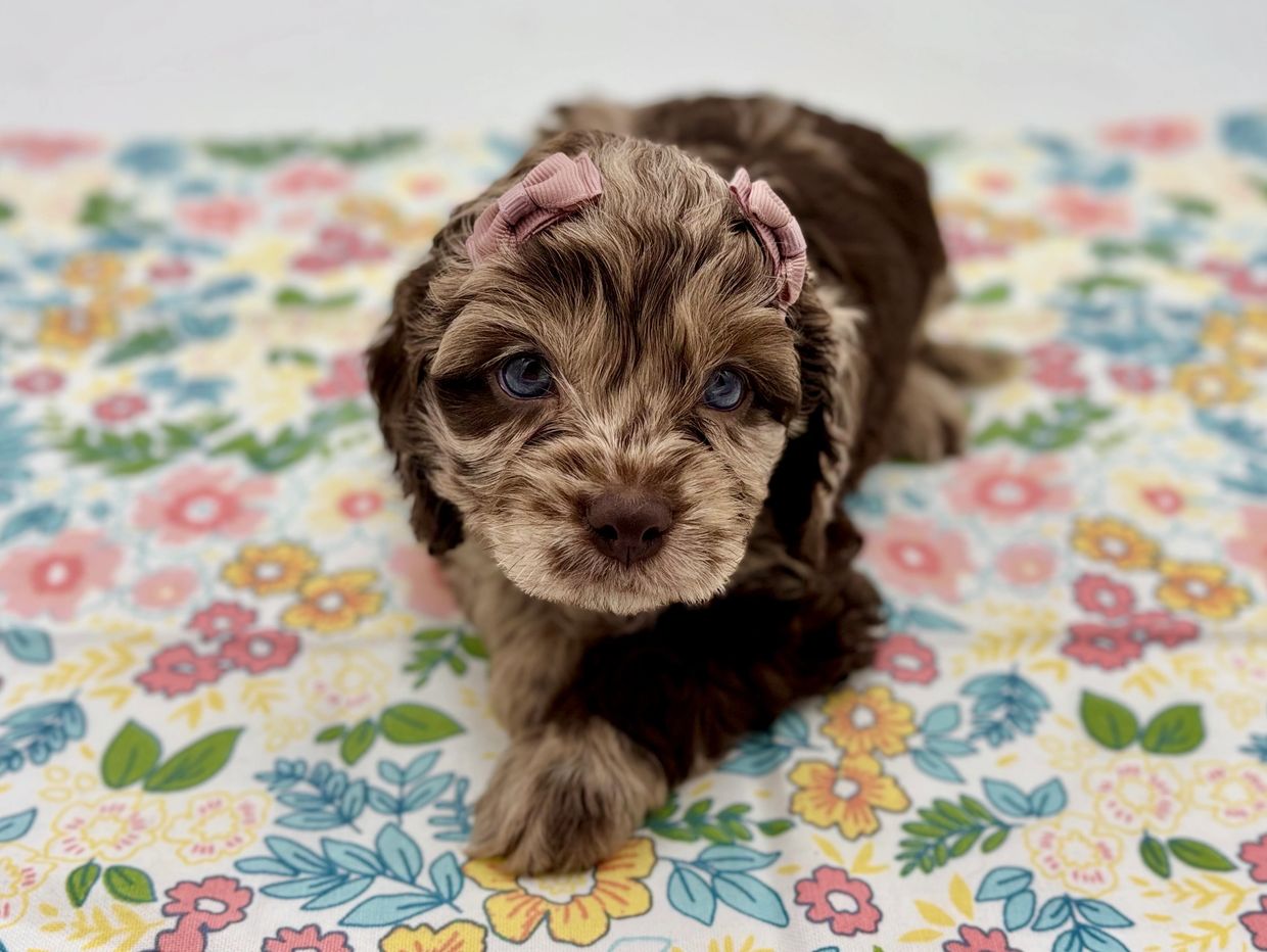 Both Cockapoos and Cavapoos are highly intelligent. They are a wonderful blend of both easily trained breeds. Our Cavapoo and cockapoos typically weigh between 14-18lbs full grown. We produce a variety of coat colors and patterns. Including red, black, black tri, chocolate tri, merle, chocolate, and chocolate merle patterns. We raise both F1 cavapoos (50% poodle and 50% cavalier) and F1b Cavapoos (75% poodle and 25% cavalier). We also raise F1 cockapoos (50% poodle and 50% cocker spaniel) or F1b (75% poodle and 25% cocker spaniel). Cavapoos have very expressive faces and the most soulful eyes. Cavapoos and cockapoo‘s are not likely to shed and have wavy to curly coats. Cockapoos tend to be on the calmer side and are true lap babies. Cavapoos also love to be at your side. Both Cavapoo and cockapoos enjoy out door activities. Making them both absolute cuddle bugs and tiny adventure partners.